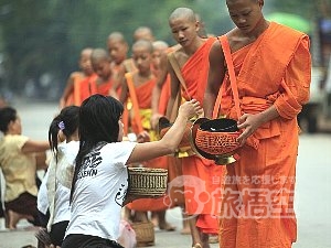 王都としての長い歴史を持ちながらも深い山々に囲まれたルアンパバーンはのどかで落ち着いており、橙色の袈裟を身に纏った僧侶たちが静かに町を行き交います。特に、早朝に行われる僧侶たちの修業「托鉢」は、ルアンパバーンの代表的な風景。ラオスの人々の仏教に対する篤い信仰心は町の寺院だけでなく、メコン川沿いの郊外にひっそりと佇む寺院でも感じられることでしょう。ルアンパバーン旅行では、是非一度町の中心にある小高い丘「プーシー」に登ってみてください。この丘の上からは、豊かな緑に包まれた町並みや幾重にも重なる山々を遠くまで望むことができます。プーシーからの眺望と雄大なメコン川に沈む夕日は、忘れられない旅行の景色になるはずです。