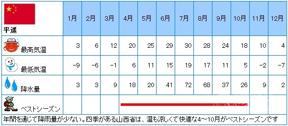 紀元前9世紀前後に建造され、明代の洪武三年(1370年)に拡張工事が行われ、ほぼ四角形の城壁に囲まれており、面積は2.25平方キロである。現在の平遥古城の主要建築物とその枠組みは600年余り前のもので、城壁や町、民家、店舗、お寺などがよく保存されており、数千年来の漢民族の伝統的な文化思想を体現し、明や清(1359年から1911年)の時代の建築物を集めた歴史博物館と言われています。