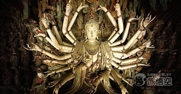 平南北124m、東西120m、寺の配置はほぼ左右対称になっています。北魏時代の創建ですが、ほとんどが明代に再建され、古くは中都寺と呼ばれていました。見どころは、各殿内に安置されている彩色塑像で、その数は2056体、そのうち1566体が完全な形で保存されています。左の伽藍配置図に記されている像、すべてが見どころですが、特に羅漢殿の十八羅漢の細かな描写、千仏殿の韋駄天の精巧さは、必見です。韋駄天(天神像ともいう)の躍動感は、西洋の彫刻の名作にも劣らないと評価され、中国の多くの美術学生が模写に訪れています。双林寺は別名「東の彩色塑像彫刻芸術の博物館」とも形容されます。