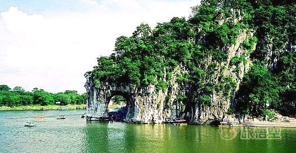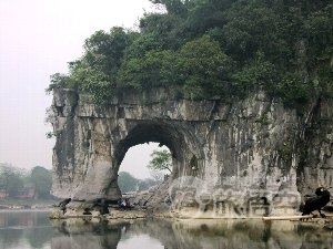 漓江とその支流である桃花江の合流点に位置。名前の由来は、象が鼻を伸ばして水を飲んでいるような姿から名付けられましたとか。水面からの高さは55m、全長108m、幅100m、 3.6億年前の海低沈積岩による巨大な象の形をした岩山。