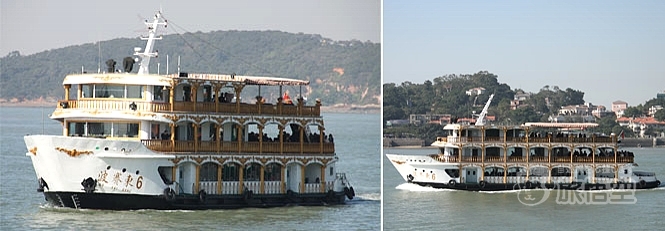 ◆ 客家料理 福建省の客家の集落は山岳部にあるため、 客家料理は鶏肉や豚肉をよく使い、油もほかの中国料理に比べると少ないのが特徴、ヘルシーな料理が多いのが特徴です。 ◆ナイトクルーズ 出発予定は19:30、厦門埠頭で乗船し、アモイ島とコロンス島の間を海滄大橋まで遊覧します、。1階席は船内でエアコン完備、2階席は屋外でオープンデッキ、3階席は有料のVIPルームとなっています。船内では歌や音楽の演奏、人形劇なども公演されます。 |