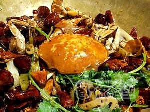 大きな鉄鍋に入った蟹と唐辛子の炒め物が看板名物のレストランで、いつも地元の人で賑わっています。