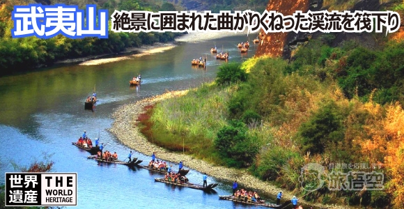 武夷山風景区の中を西から東に流れる九曲渓という山沿いに広がる景勝地。ここをいかだに乗って楽しむのが武夷山観光の目玉の一つ。出発点の星村から終点の武夷宮までは約10㎞。途中。いかだから眺める両岸の奇岩は絶景。