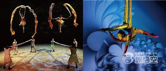 男女入り乱れで天井から吊るされたシルクのベルトにからだを巻きつけ、巻きつけられた者同士が絡み合いアクロバット技を披露するというもの。首にベルトを巻きつけた女性がクルクル回ったり、巻きつけた紐を解きながら上から降りてくるシーンなどは見逃せません!
