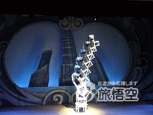 上海雑技とは要はサーカスなのですが、限界に挑戦しているのが観ていて伝わってきます。「いすの積み上げ」と呼ばれるショーは、いすをどんどん積み上げて様々な姿勢をとるので、その高さに一瞬緊張感が走ります。その他「柔軟技」など幻想的な音楽と照明に思わず惹かれます。