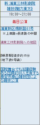 | 19:15 弊社発行の雑技電子チケットをもって受付へ 19:30 雑技開演。 21:00 雑技終了。 自由解散 |