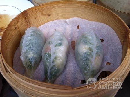 飲茶の具の海老、野菜は大きめに刻まれていて、味、食感ともに◎