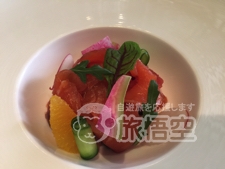 前菜〜自家製スモークサーモンのサラダ〜はスモークの香りがふわっと口の中に残るサーモン。オレンジ、レッドラデッシュが添えられた見た目も綺麗なカラフルなサラダです。