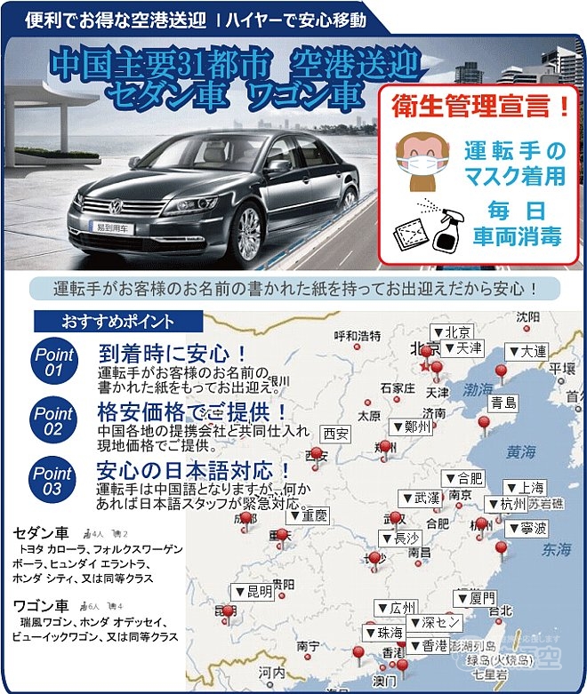空港到着出口にて、運転手がお客様のお名前の書かれた紙をもってお出迎え致します。タクシーの列に並ばなくよく、またタクシーと比べても料金の大差がなく、多くのお客様にご利用頂いております。また市内貸切は、タクシーや地下鉄が不便な中国では大変便利だと好評を頂いております。ビジネスから観光まで、是非ご利用ください。